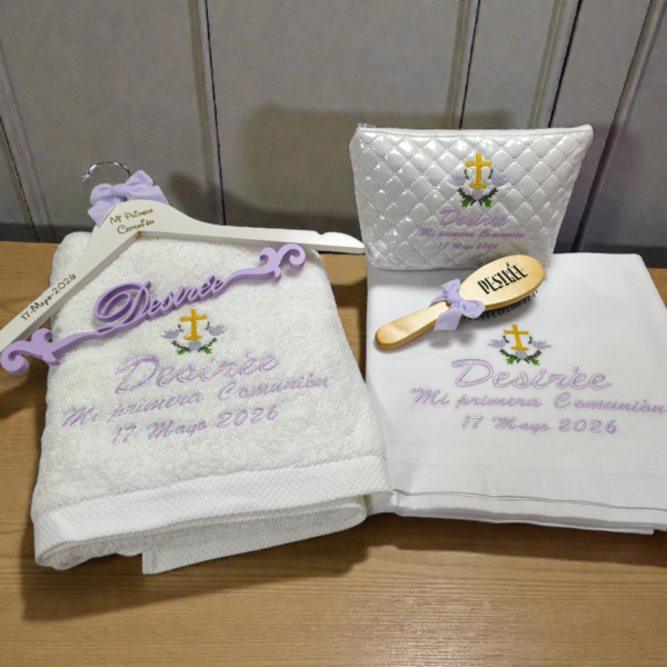 Este conjunto incluye toalla bordada, juego de sábanas personalizado, neceser acolchado, percha grabada y cepillo personalizado, todo diseñado en delicados tonos lila y blanco, con bordado de cruz y nombre. Un conjunto coordinado que no solo viste su día especial… sino que lo convierte en un recuerdo eterno.