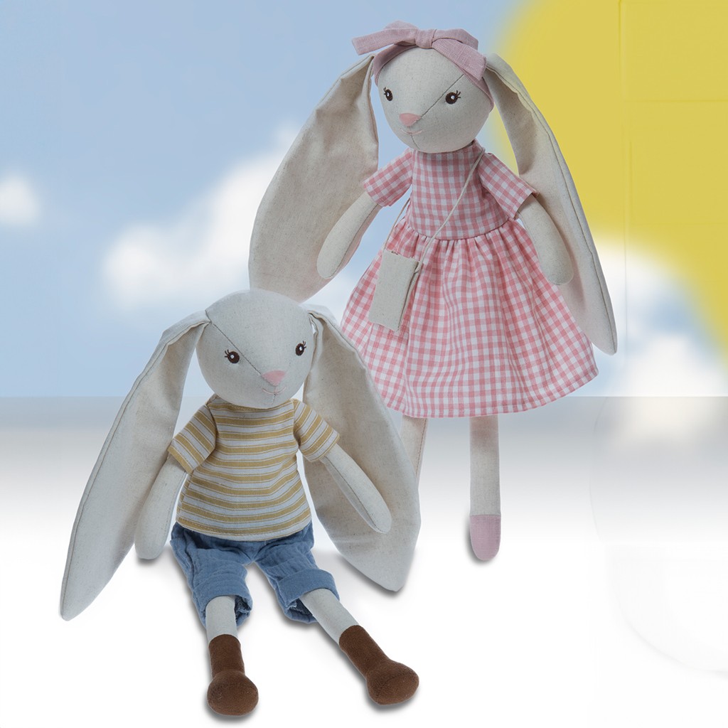 Peluche muñeca en forma de conejitas . Tamaño: 40 cm de altura. Composición: 100% Poliéster. Tacto muy suave y agradable. Detalles bordados.