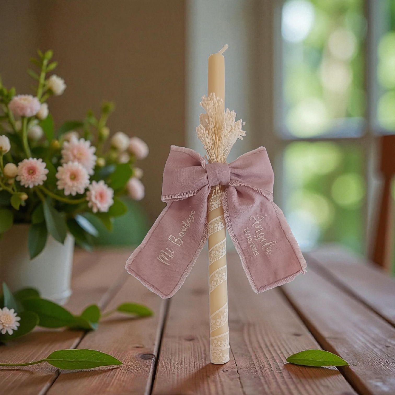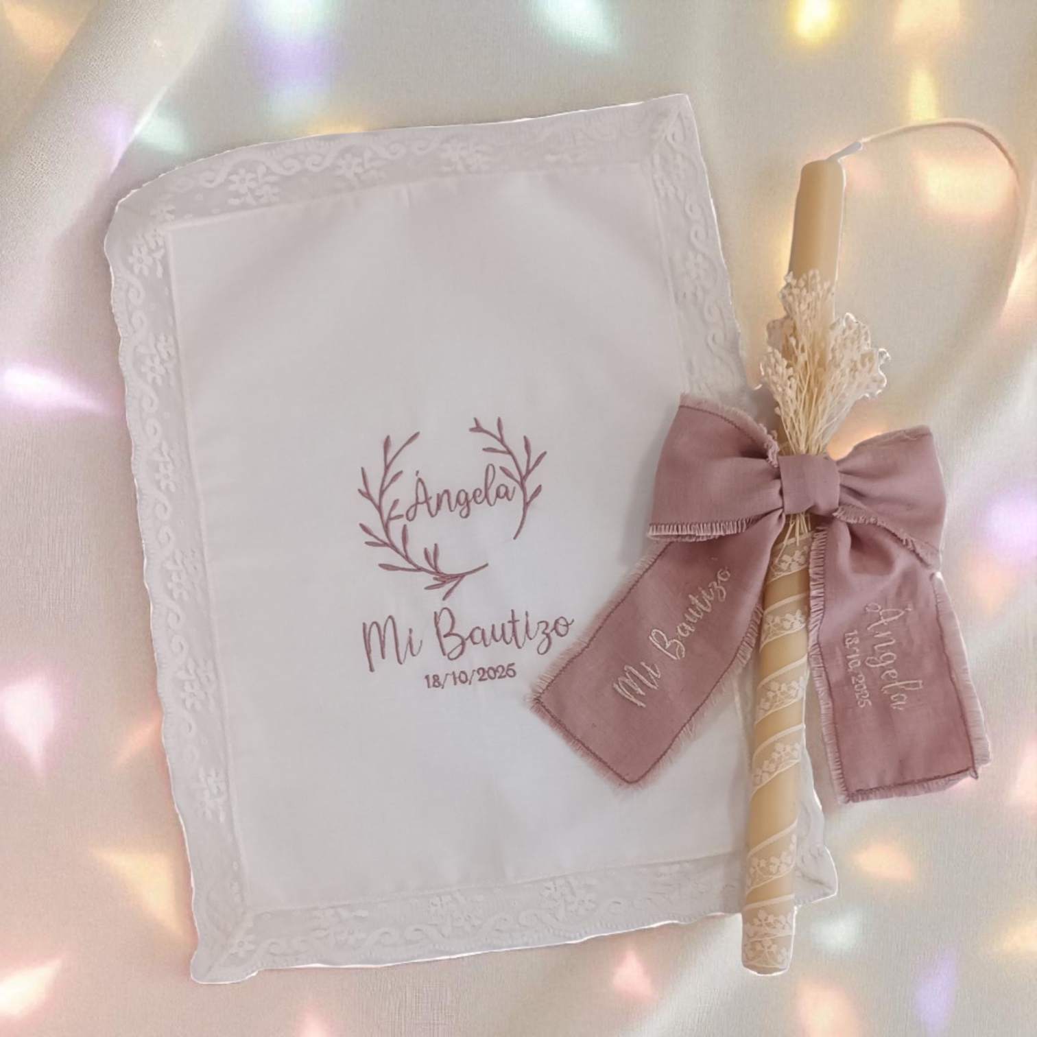 Pañuelo en tonos marfil bordado con un diseño de corona y ramita alrededor que se puede bordar del color que desees.Va acompañado de una vela perfecta para utilizar durante el sacramento