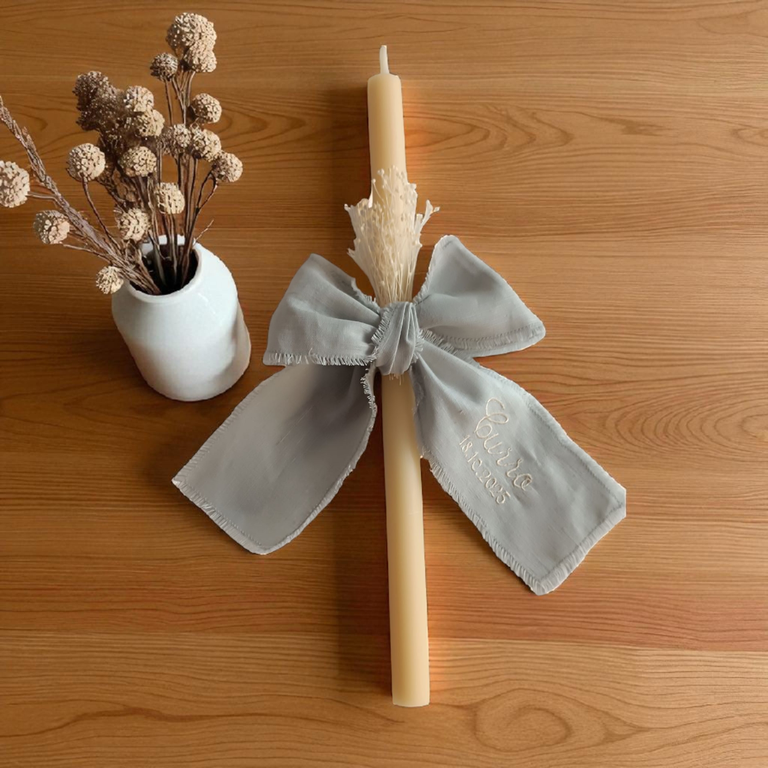 Esta preciosa vela de bautizo personalizada con un lazo de lino que se puede elegir el color, es ideal para una ceremonia llena de luz y significado.